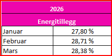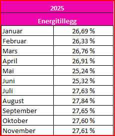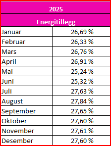 Basert på prisutvikling for diesel og strøm, beregnes det et variabelt energitillegg. Tillegget justeres hver måned i henhold til løpende pris- og kostnadsutvikling.
